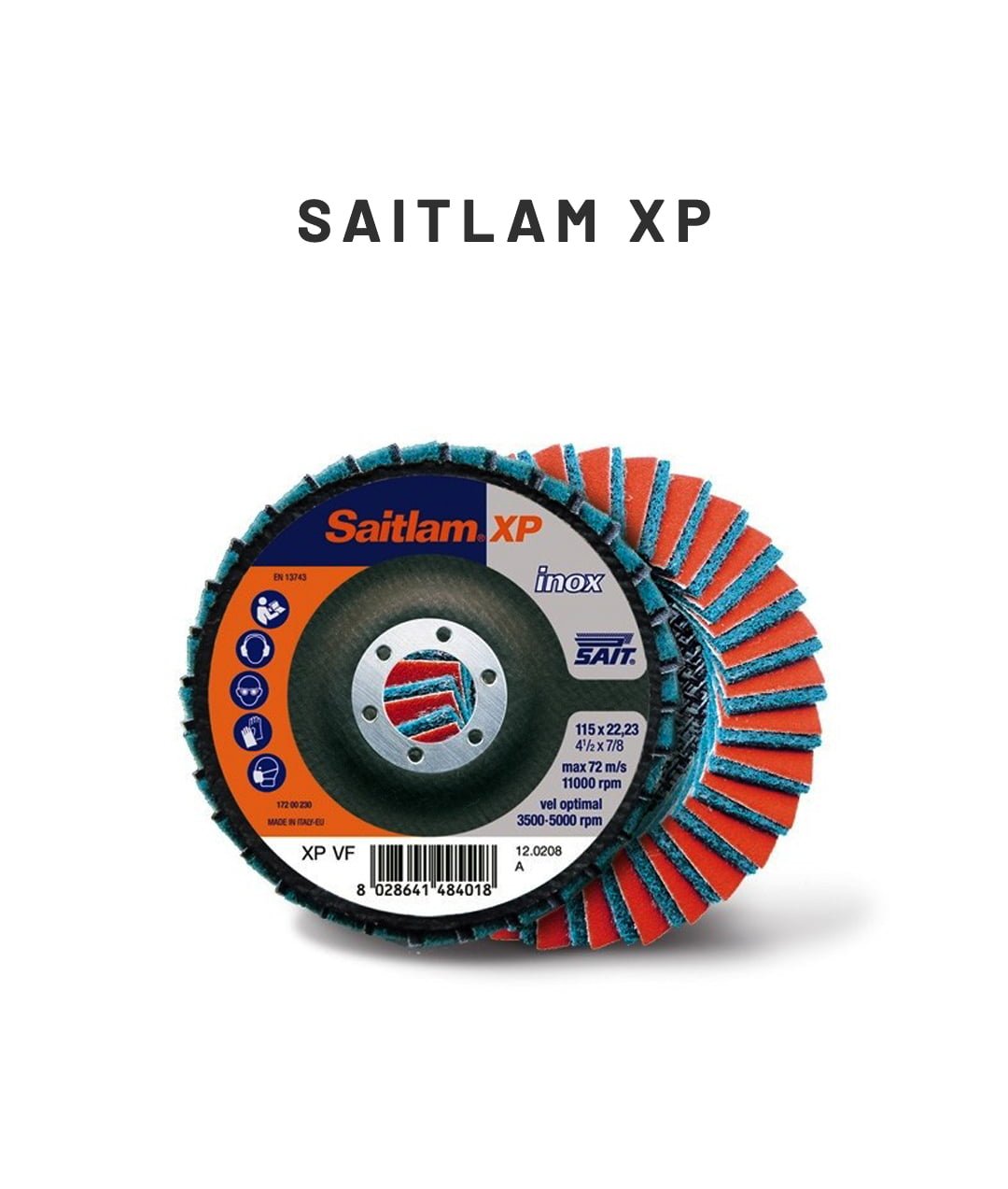 O disco flap SAITLAM XP possui tecnologia SCM (surface conditioning) com abrasivo cerâmico de última geração num suporte de fibra de vidro, tornando sua performance excelente em Aços Inox, Aços e Alumínio.
