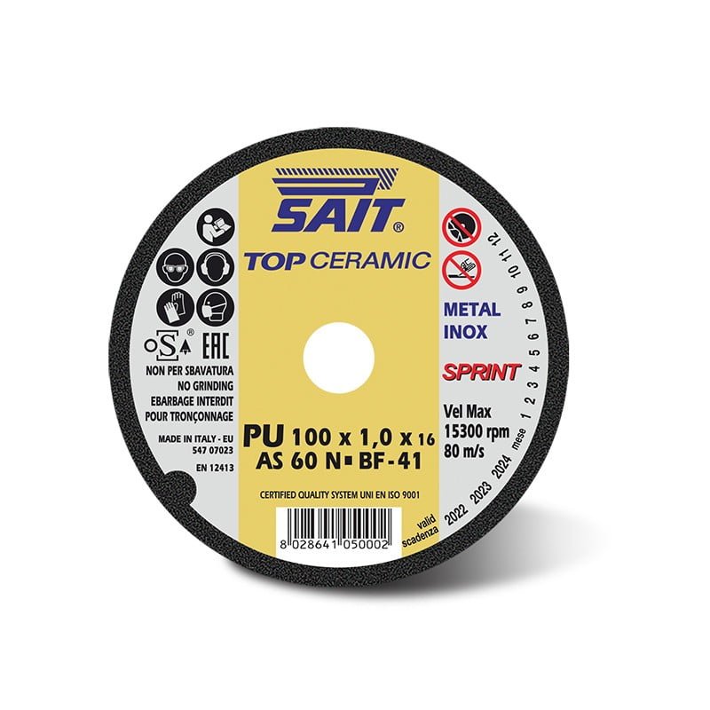 O disco de corte AS60N  SPRINT faz parte linha de discos rígidos cerâmicos da SAIT Abrasivos, um disco de corte plano, para aplicações com máquina portátil no setor metalúrgico. Indicado para utilização em aço carbono, ligas e aço inox.