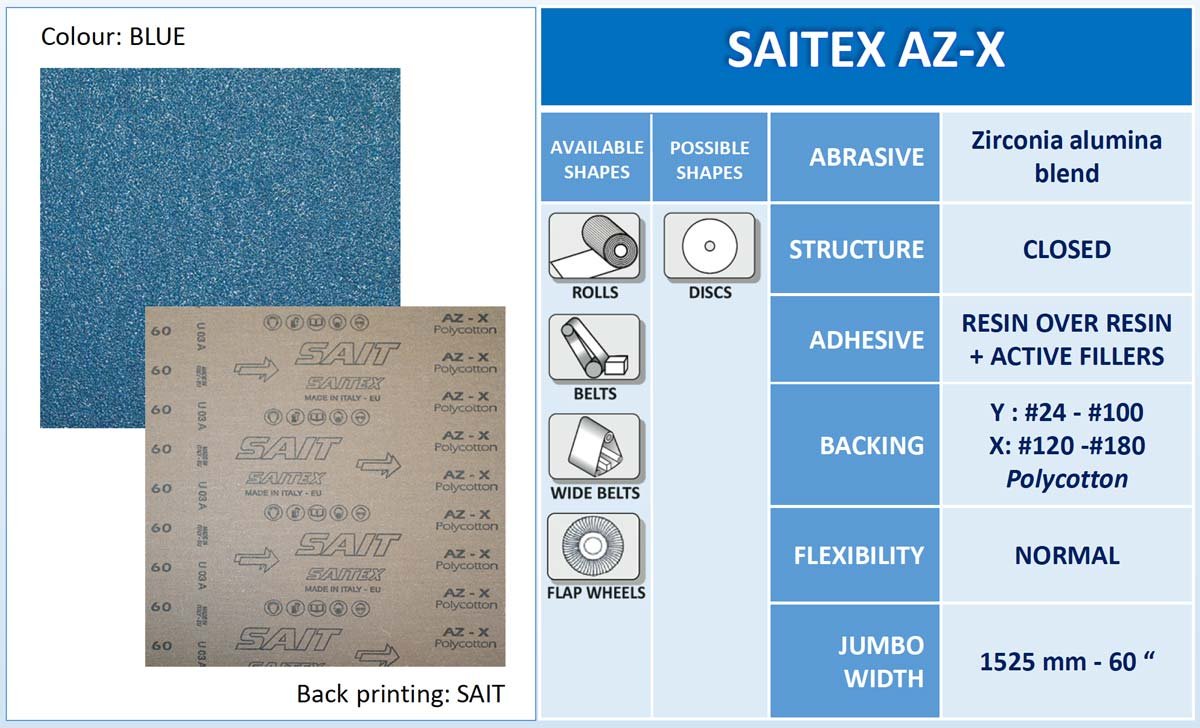 A lixa SAITEX AZX da linha SAIT, é ideal para operações pesadas, pois como é fabricada em polycotton possui excelente resistência mecânica.